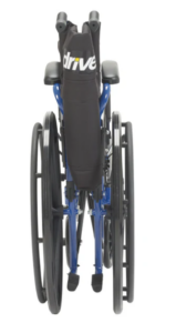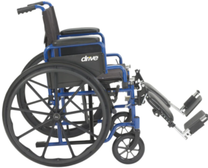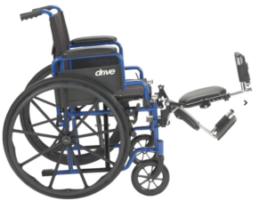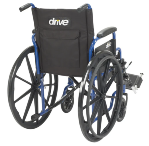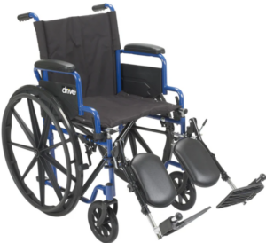 Chaise roulante pliante avec assise de 20″ (pouces) bleu anodisé et lève-jambes et reposes pieds amovibles.